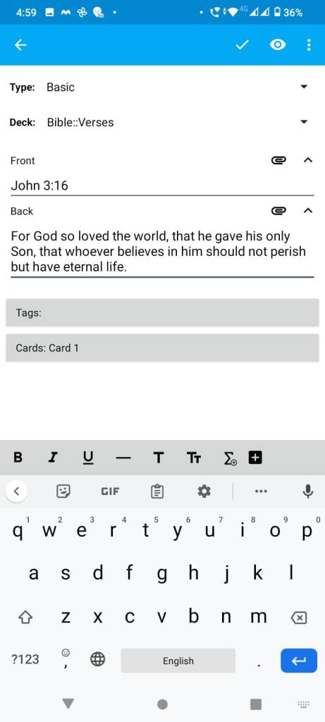 A final reminder: if you would like to get into this, but don't think you can find your way around making the cards, get in touch and I'll do my best to help you. Whether with my help or not, and whether with Anki or not: I hope you get into memorising Scripture, and may God bless you through it.